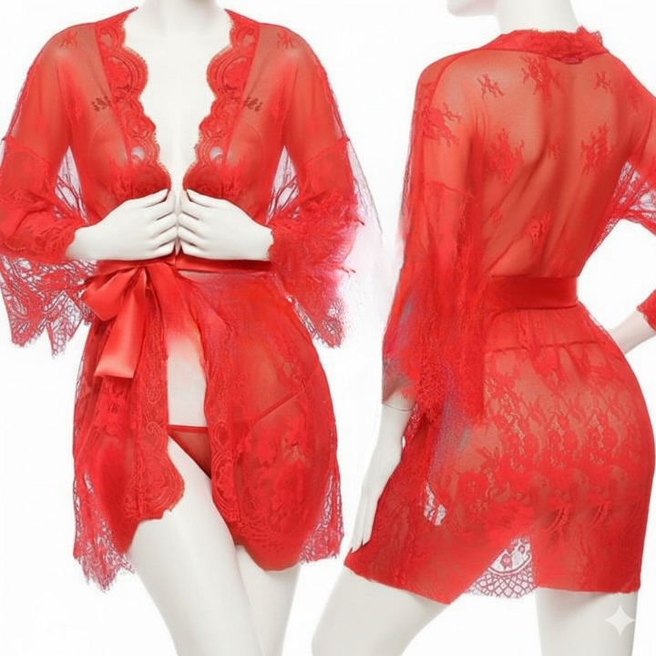 Single Pcs Women’s Net Transparent Sheer Lace Robe Is Designed To Enhance Nighttime Elegance With Its Stylish And Comfortable Look. Featuring Long Sleeves And A Satin Belt, It Offers A Beautiful Fit While Remaining Light And Easy To Wear. The Free-Size Design Ensures Comfort For Various Body Types, Making It Ideal For Daily Nightwear Or Relaxed Lounge Use. Its Sheer And Graceful Appearance Adds A Touch Of Sophistication To Any Nighttime Routine.
